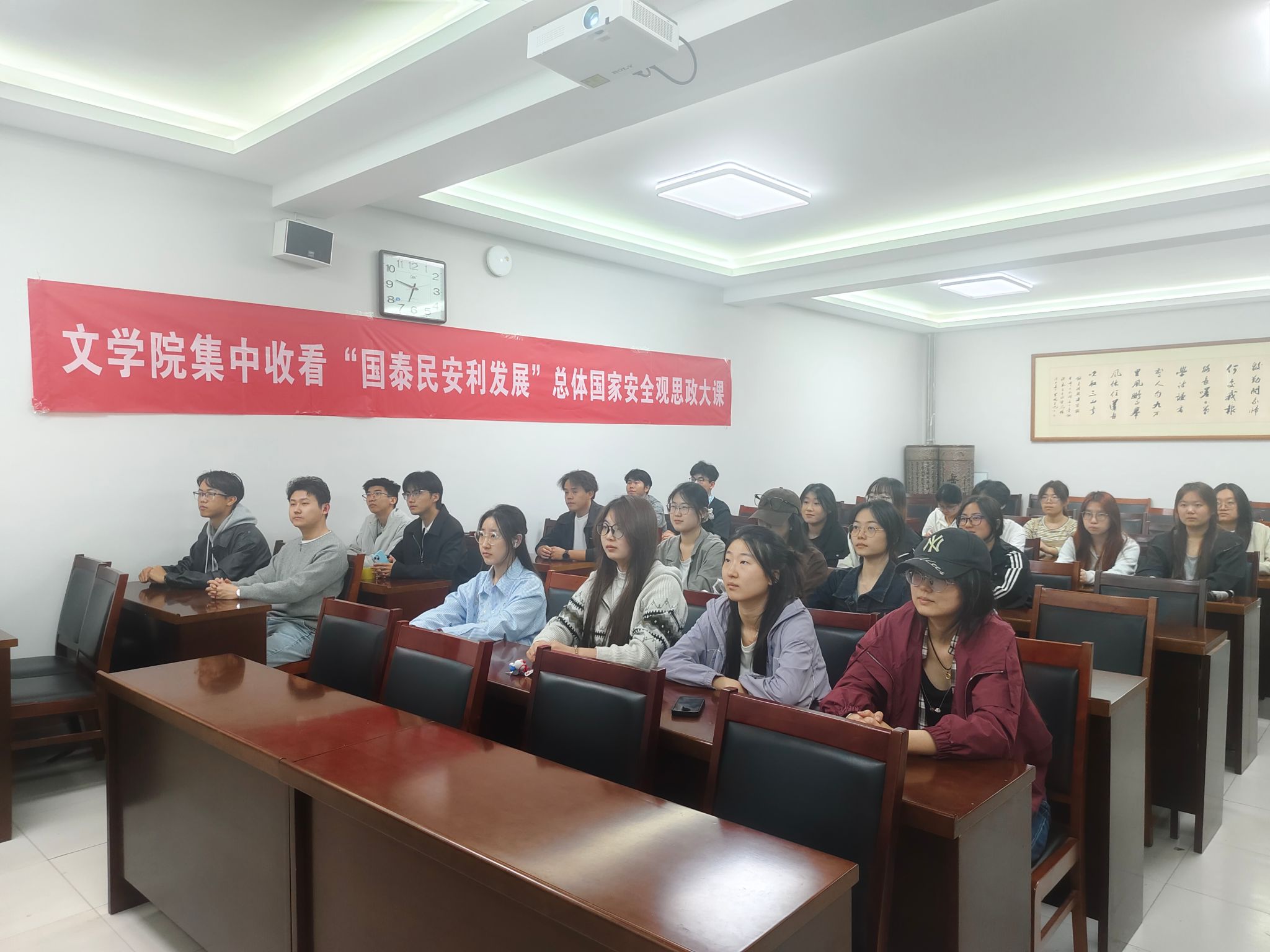组织学生代表在三教418集中收看了由人民日报客户端推出的“国泰民安利发展”总体国家安全观思政大课。
