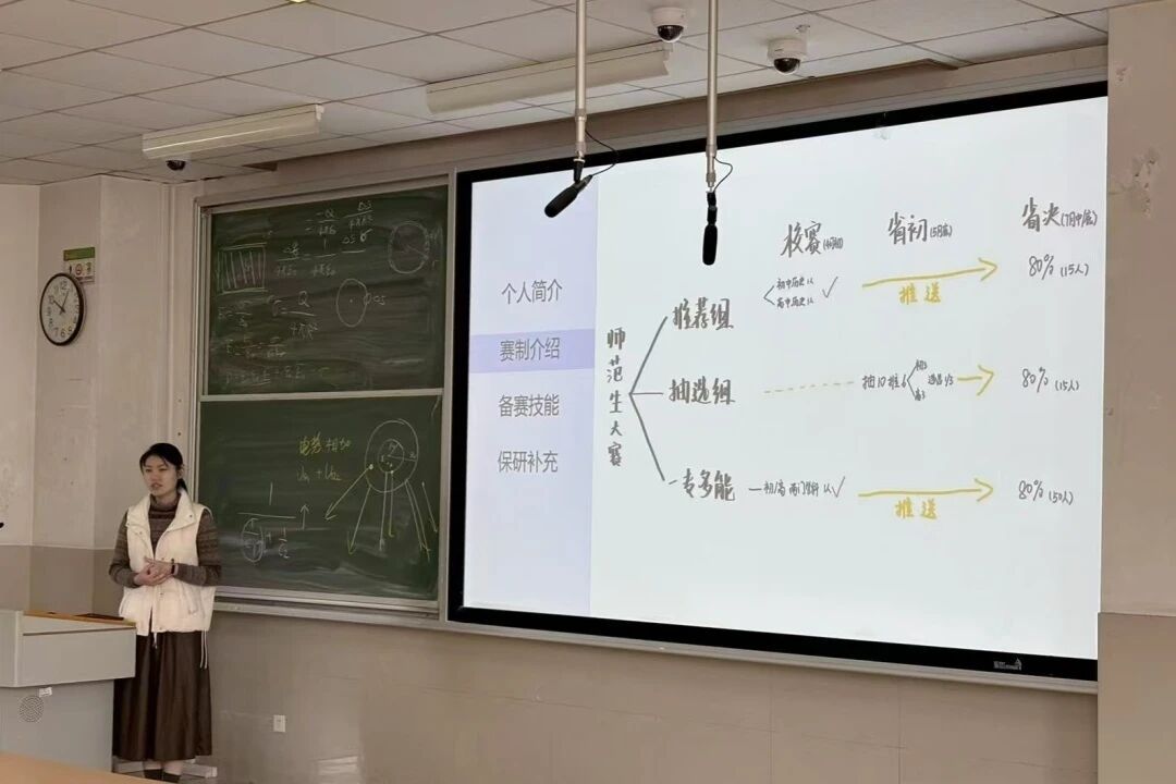 胡千羽结合自身科创实践经历,分享了备赛与考研的衔接策略,建议同学们将科创项目中的研究方法与文献积累灵活运用于考研专业课学习。刘小璐指出尽早明确发展方向的重要性,提醒同学们避免备考过程中的精力耗散,并建议在科创与论文方面提前规划,采取“学硕+专硕”双轨准备,做好心态管理。王依诺详细介绍了推免的必要条件,并分享了科研与实践经验,鼓励同学们主动联系导师参与课题,积极投身实习与志愿服务。李筱影则叮嘱有意考取专硕或从事教师职业的同学,推荐其参与相关教学比赛,并分享了备赛要点,如紧扣评分标准、设计多元评价方式、构建互动课堂、形成个人教学风格等。侯添润围绕推免相关竞赛展开分享,以“大广赛”为例,强调赛道选择与作品创意的关键作用,建议同学们在参考往年获奖作品的基础上,注重品牌适配与内容创新,全面提升作品质量。