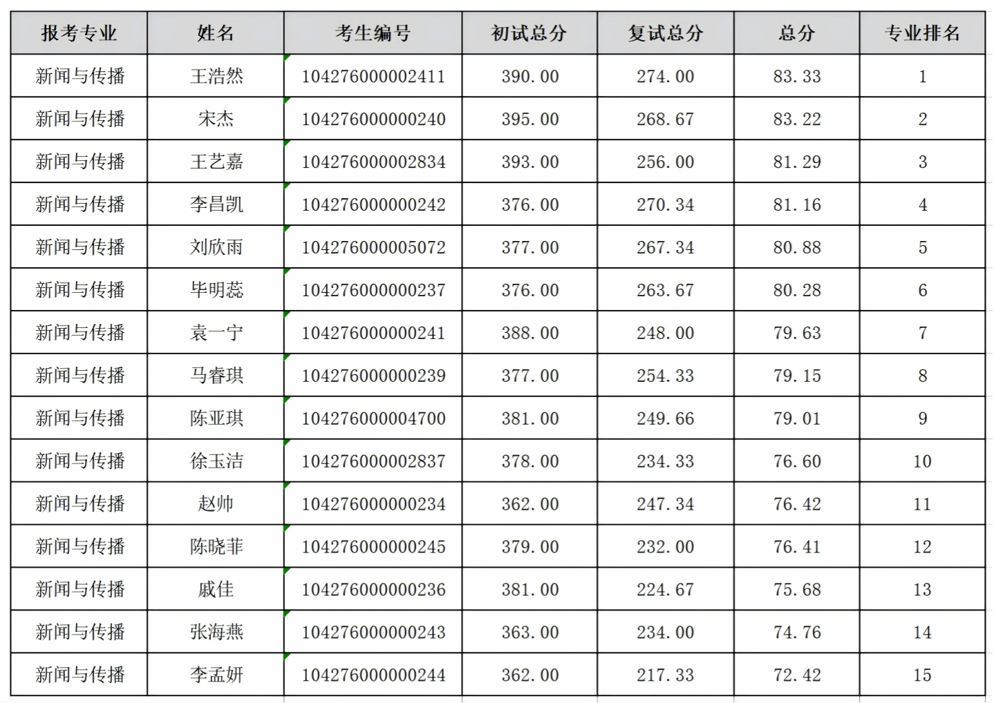 现将(050100)中国语言文学、(045103)学科教学(语文)、(055200)新闻与传播、(055300)出版硕士研究生一志愿批次考生成绩予以公示。