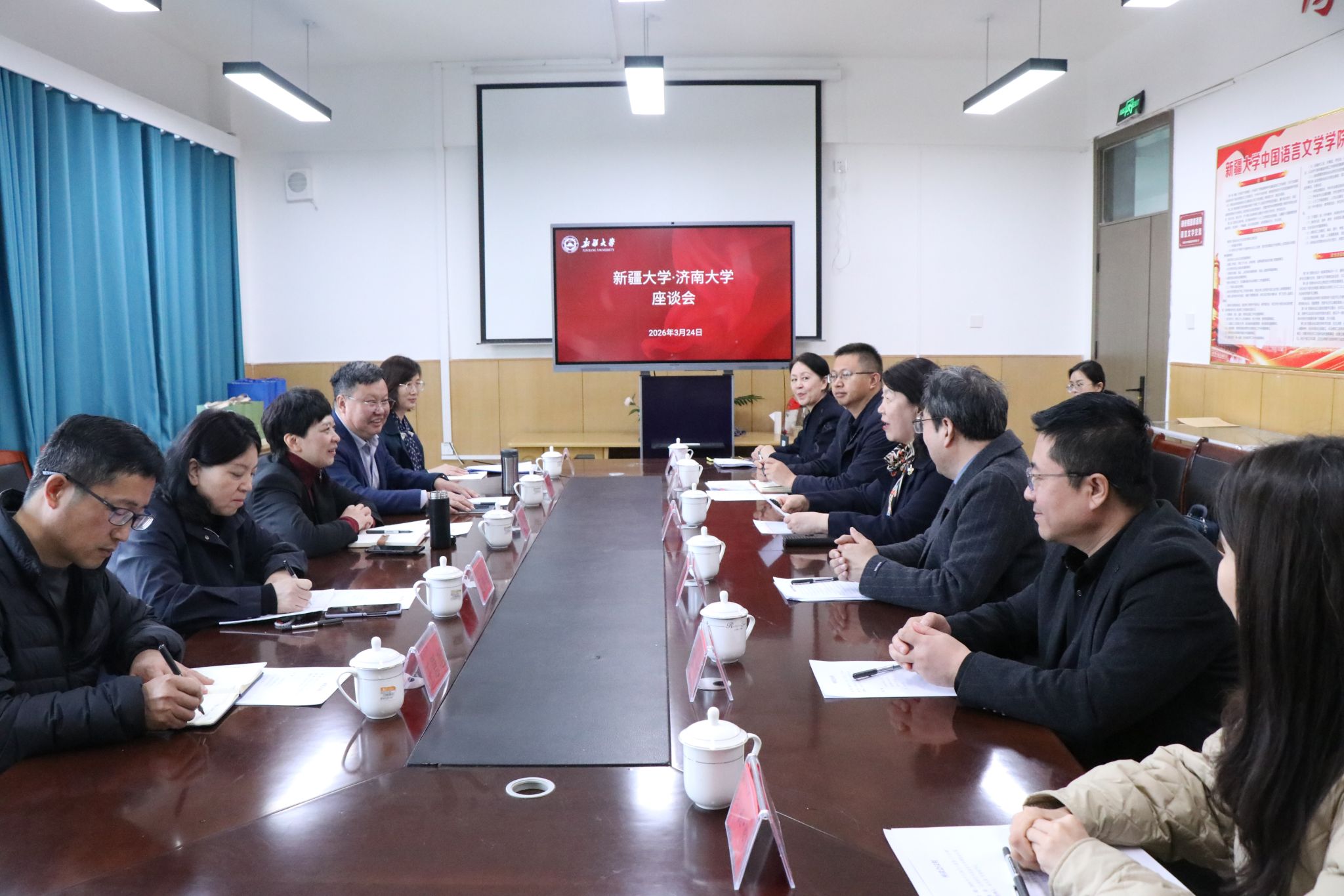 在自由交流环节,我校与三所高校围绕人才培养、学科建设、科研合作、社会服务等议题展开深入探讨,重点聚焦如何通过校际合作服务中华优秀传统文化传承发展、助力边疆地区高质量发展。各方一致表示,将持续加强务实合作,在语言文字推广、实习基地建设等方面不断深化拓展,推动合作走深走实。