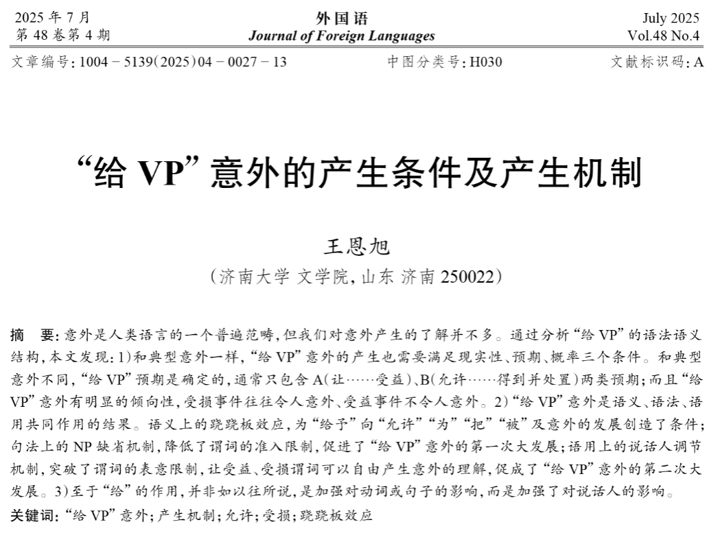 王恩旭教授在《外国语》(CSSCI)2025年第4期上发表学术论文《“给VP”意外的产生条件及产生机制》。该论文系国家社科基金项目“汉语词的模板式释义方法及释义模板库建设研究”(项目号:19BYY030)的重要阶段性成果。