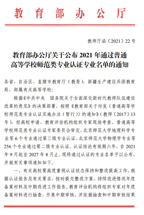 近日,教育部公布了2021年通过普通高等学校师范类专业认证专业名单,我校自慰高潮